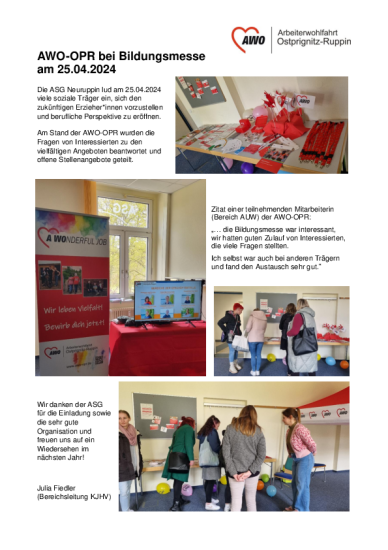 Die ASG Neuruppin lud am 25.04.2024 viele soziale Träger ein, sich den zukünftigen Erzieher*innen vorzustellen und berufliche Perspektive zu eröffnen. Am Stand der AWO-OPR wurden die Fragen von Interessierten zu den vielfältigen Angeboten beantwortet und offene Stellenangebote geteilt. Wir danken der ASG für die Einladung sowie die sehr gute Organisation und freuen uns auf ein Wiedersehen im nächsten Jahr!