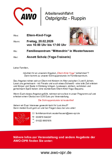 Das Familienzentrum "Mittendrin" in Wusterhausen bietet am 20.02.2026 eine kostenlose Schnupperstunde "Eltern-Kind-Yoga" an. Interessierte Familien melden sich bitte im Familienzentrum bzw. unter den bekannten Kontaktdaten.
