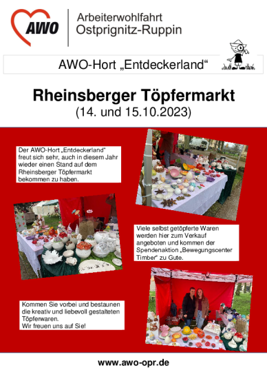 Der Hort „Entdeckerland“ freut sich sehr, auch in diesem Jahr wieder, einen Stand auf dem Rheinsberger Töpfermarkt bekommen zu haben. Viele selbst getöpferte Waren werden hier zum Verkauf angeboten und kommen der Spendenaktion „Bewegungscenter Timber“ zu Gute. Kommen Sie vorbei und bestaunen die kreativ und liebevoll gestalteten Töpferwaren.