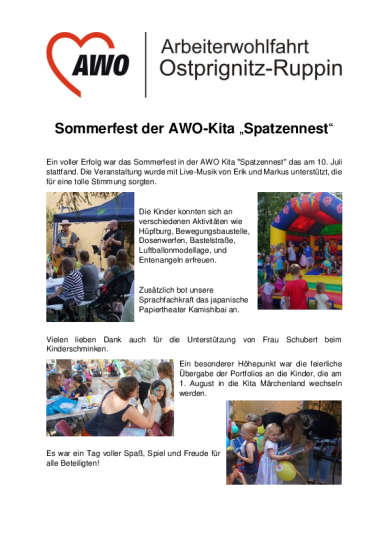 Ein voller Erfolg war das Sommerfest in der AWO Kita "Spatzennest", das am 10. Juli 2024 stattfand. Die Veranstaltung wurde mit Live-Musik von Erik und Markus unterstützt, die für eine tolle Stimmung sorgten.