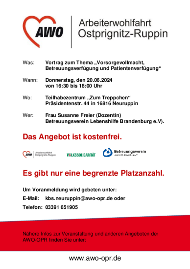 Um Voranmeldung wird gebeten unter: E-Mail: kbs.neuruppin@awo-opr.de oder